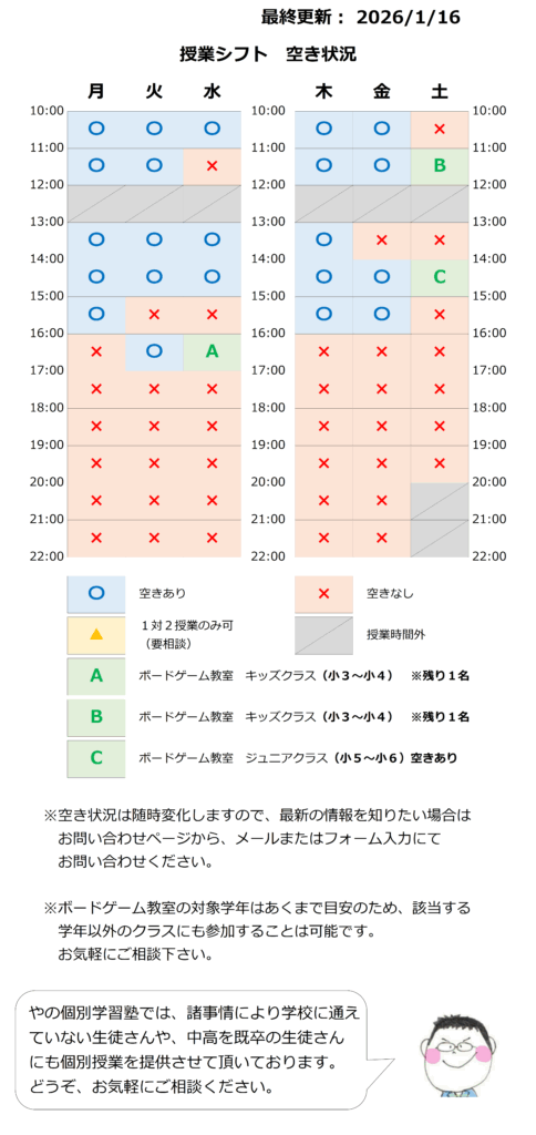 2026年2月以降に空きができる予定ですので、入塾や体験授業をご希望の方は、お問合せフォームにてご連絡下さい。